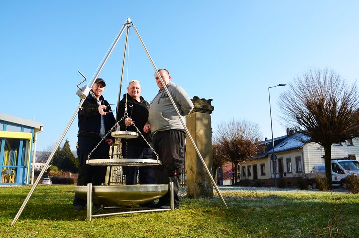 Betriebsleiter Markus Rockenbach und das ganze Team aus Mitarbeitenden und Beschäftigten sind mächtig stolz auf das Qualitätsprodukt, das in vielfacher Hinsicht einzigartig ist: „Durchdacht und robust ist dieser „Dreibein“ mit Seilzug, Feuerschale und dem Grillrost.