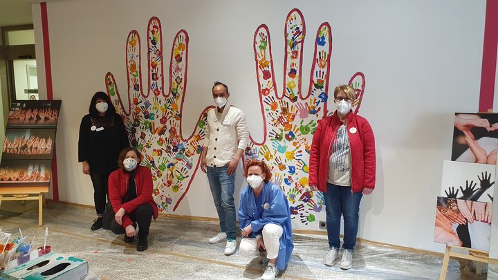 Jedes Jahr am 5. Mai ruft die Weltgesundheitsorganisation zum Aktionstag Saubere Hände auf. Es ist ein Tag, an dem Einrichtungen im Gesundheitswesen teilnehmen, um das Bewusstsein für die Bedeutung sauberer Hände im medizinischen Alltag zu schärfen. Coronabedingt fallen viele Veranstaltungen aus, doch im Diakonie Klinikum Neunkirchen (DKN) hat man einen Weg gefunden diesem wichtigen Thema trotz Einschränkungen die notwendige Aufmerksamkeit zu schenken: Die Lenkungsgruppe Aktion Saubere Hände und die Hygienefachkräfte des Klinikums haben Stationen im Foyer des Hauses aufgebaut, die sich spielerisch rund um das Thema Hände und Desinfektion drehen. Mitarbeitende konnten sich mit bunten Händeabdrücken an einer großen Wand in der Eingangshalle verewigen. Zusammen ergibt das Mosaik zwei überdimensionale Hände, die den Zusammenhalt der Mitarbeitenden symbolisieren und vor allem eines: Händedesinfektion ist jedermanns Sache, dafür stehen sie gemeinsam ein. An einer weiteren Station konnte man mit einer Schwarzlichtlampe und Händedesinfektionsmittel mit einem fluoreszierenden Zusatz überprüfen, wie effektiv die eigene Händedesinfektion tatsächlich war: „Eine Handfläche voll Desinfektionsmittel, 30 Sekunden verreiben, wenn es sich zwischendurch zu trocken anfühlt, darf man gerne noch einen Nachschlag nehmen. Die Handgelenke, Daumen und Handoberflächen bedenken, die werden gerne vergessen“, erinnert Barbara Lamber, Hygienefachkraft im DKN.