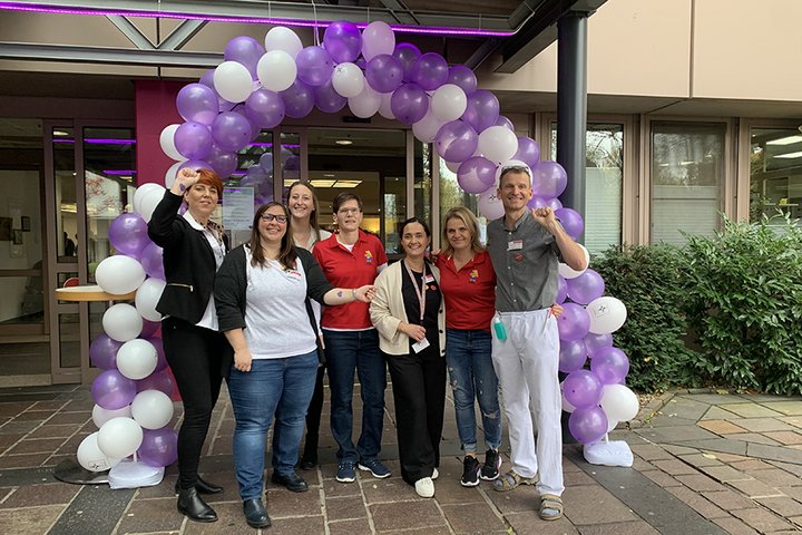 Mit lila Ballons, einem lila beleuchteten Klinikeingang und einem bunten Fest feierte das Diakonie Krankenhaus am 17. November den Weltfrühgeborenentag. Neben der Teilnahme an der weltweiten Aktion „Light it up purple“ hatten die Mitarbeitenden der Geburtshilfe, der neonatologischen Kinderintensivstation sowie zahlreiche Ehrenamtliche Info- und Mitmachstände im Foyer des Krankenhauses aufgebaut. Gemeinsam setzten sie ein Zeichen, um auf die Bedürfnisse von Frühgeborenen und ihren Familien aufmerksam zu machen. Im Kreis Bad Kreuznach kümmert sich das zertifizierte Perinatalzentrum des Diakonie Krankenhauses um die Belange von Kindern, die zu früh oder mit Erkrankungen auf die Welt kommen. „In Deutschland werden jedes Jahr mehr als 60.000 Kinder vor der vollendeten 37. Schwangerschaftswoche geboren. Hier in der Region sind wir das einzige spezialisierte Krankenhaus, das die hohen Anforderungen an die pflegerische und medizinische Versorgung der Allerkleinsten erfüllt“, sagt Dr. Christoph von Buch, Chefarzt der Kinder- und Jugendmedizin.