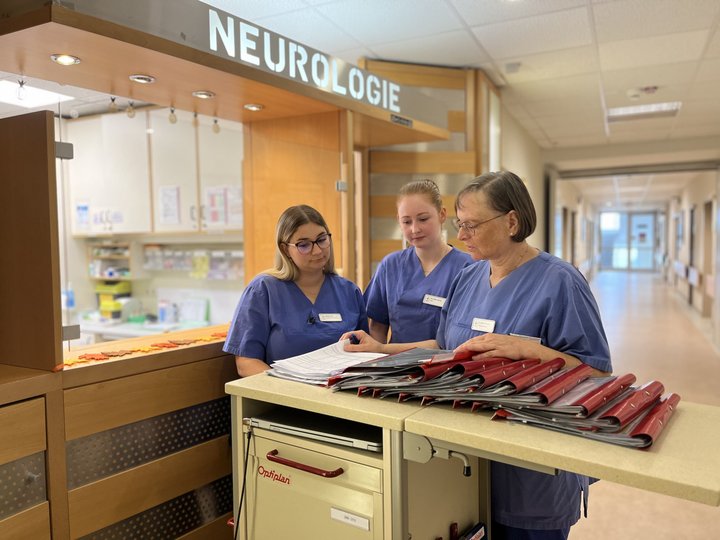 „Es ist erstaunlich, wie schnell selbst Lähmungserscheinungen wieder verschwinden können, wenn wir früh genug mit einer gezielten Behandlung einschreiten“, berichtet Bärbel Schäfer, Gesundheits- und Krankenpflegerin und Stationsleitung der Stroke Unit im Diakonie Klinikum, einer zertifizierten Schlaganfallstation. Fachärzte sowie Gesundheits- und Krankenpfleger behandeln dort gemeinsam mit erfahrenen Logopäden, Physio- und Ergotherapeuten und mithilfe modernster technischer Ausstattung, engmaschig ihre Patienten. „Sobald die Symptome eintreten, hat man maximal vier bis fünf Stunden, um die Ursache des Schlaganfalls, zum Beispiel ein Gefäßverschluss oder ein Blutgerinnsel, zu lokalisieren und zu beseitigen, um die bestmöglichen Ergebnisse zu erzielen“, erklärt Lea Mayer. Die 24-jährige Gesundheits- und Krankenpflegerin hat vor zwei Jahren die Zusatzqualifikation als Stroke Nurse erworben. Insgesamt sieben Kolleginnen und Kollegen auf der neurologischen Station des DKN sind mittlerweile so ausgebildet. Jedes Jahr kommt jemand hinzu: „Die Ausbildung dauert neun Monate und umfasst Präsenzunterricht, Aufgaben die wir mit eigenständigem Literaturstudium lösen müssen, mündliche und schriftliche Prüfungen. Es ist sehr umfangreich und anspruchsvoll“, fasst Jenny Grunder zusammen, die sich gerade in den letzten Zügen ihrer Weiterbildung zur Stroke Nurse befindet. Die Zeit, die sie in die Professionalisierung ihres Berufsbildes investiert, zählt zur Arbeitszeit, die Kosten werden vom Arbeitgeber, der Stiftung kreuznacher diakonie, übernommen. Der Mehraufwand lohnt sich sowohl für die Pflegekräfte als auch für das Team, weiß ihre Vorgesetzte Schäfer: „Die Ausbildung zur Pflegefachfrau oder zum Pflegefachmann deckt das Spezialwissen nicht ab. Die neuesten Erkenntnisse der Medizin entwickeln sich sehr dynamisch. Dadurch, dass wir jedes Jahr jemanden in die Ausbildung entsenden, profitiert unser ganzes Team von dem Wissen das dort vermittelt wird.“