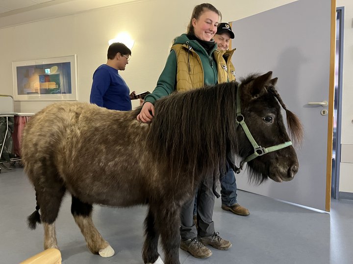 Da steht ein Pferd auf’m Flur – ganz ohne Heijo, Helau und Alleh Hopp. Die Stute Lena war von der Dachsbau-Ranch in Dudweiler mit ihren Besitzern Klara Dreßler und Mathias Lenzen angereist, um die Bewohnerinnen und Bewohner des Paul Marien Hospizes in Saarbrücken zu besuchen. Tiere sind dort herzlich willkommen. Menschen, die im Paul Marien Hospiz wohnen, können ihre Tiere mit in die Apartments bringen, im Gemeinschaftsraum zwitschern Vögel und jeden Montag kommen speziell ausgebildete Therapiehunde vorbei. Aber der Besuch von Shetlandpony Lena war eine Premiere. Auf die Idee kam Mitarbeiterin Angelina Perey, die seit sechs Jahren reitet und ihr Pferd auf der Ranch eingestellt hatte. Die Gesundheits- und Krankenpflegerin kannte das vierjährige Pony und weiß, dass sie genau die Richtige war für den tierischen Besuch. Lena war erfahren, sie war ein Lehrpferd und hatte zuvor schon Seniorenheime besucht. Sie schlenderte gemächlich durch die Flure im Hospiz, ließ sich von den Bewohnerinnen und Bewohnern, die Lust dazu hatten, streicheln und füttern. Zu manchen, die es sich gewünscht hatten, ging sie sogar ans Bett. „Wir arbeiten gerne mit Tieren im Paul Marien Hospiz, denn sie gehen ganz wertfrei auf Menschen zu. Es ist ihnen egal, wie wir aussehen, ob wir krank sind oder gesund“, erklärt der stellvertretende Leiter der Einrichtung Thomas Steffen. Er und sein Team erleben oft wie Menschen, die sich aufgrund ihrer schweren Erkrankung zurückziehen, aufblühen, mobiler und aktiver werden. Auch Lena lockte Bewohner aus ihren Zimmern, die sonst lieber für sich sind. Eine Bewohnerin erinnerte sich an ihre Kindheit zurück, als sie ein junges Mädchen war, lebte sie auf einem Bauernhof. Lena ließ bei ihr schöne Erinnerungen wieder aufleben. Die Pferdefreundin kam strahlend ins Erzählen und freute sich, dass sie Lena ausgiebig streicheln konnte. Für die Besucher und die Mitarbeitenden war der Vierbeiner auch ein absolutes Highlight und bekam besonders viel Zuneigung und Karotten zum Knabbern an diesem Tag. Ein rundum gelungener Besuch und für Perey und Steffen ein Zeichen, dass sie in Zukunft gerne wieder ein Pony ins Hospiz einladen möchten: „Das machen wir im Sommer wieder, dann gehen wir raus in unseren schönen Garten, da können wir dann mit den Bewohnern draußen ein kleines Event veranstalten.“