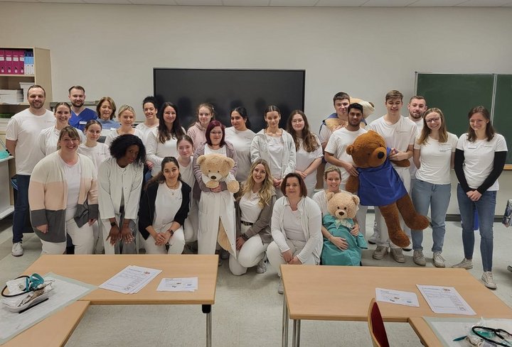 Die Teddyklinik richtete sich an Kinder im Vorschulalter, die ihre Stofftiere als Patientinnen und Patienten mitbrachten. Gemeinsam mit Auszubildenden der Krankenpflegeschule, Medizinstudierenden im Praktischen Jahr und freiwilligen Helfern durchliefen die kleinen Besucher die Stationen eines Krankenhauses – von der Anmeldung, bei der die Anamnese-Bögen ausgefüllt wurden, über die Untersuchung bis zur Behandlung. Dabei durften die Kinder in die Rolle der Kuscheltiereltern schlüpfen und gemeinsam mit den Teddy-Ärzten ihren flauschigen Freunden helfen. Je nach Krankheit wurde die Lunge abgehört, Fieber gemessen, Blut abgenommen oder die Kuscheltiere mit Pflastern, Verbänden oder Schienen für gebrochene Knochen versorgt. Im Labor wurden Blutproben untersucht und unter dem Mikroskop betrachtet. Bei Bauchschmerzen kamen Röntgen- oder MRT-Geräte zum Einsatz, die mitunter für lustige Überraschungen sorgten - wie etwa eine Quietscheente, die im Bauch eines Teddys gefunden wurde. Besonders spannend wurde es im Operationsaal: Mit echter OP-Haube und ganz nah am Geschehen konnten die Kinder zusehen, wie ihre Kuscheltiere fachgerecht operiert wurden. Zum Abschluss erhielt jedes Kind in der Apotheke eine Urkunde und ein kleines Überraschungspaket. Doch damit war der Besuch noch lange nicht beendet. Im Aufenthaltsraum wurde weiter gemalt, gebastelt und viel über den menschlichen Körper gelernt.