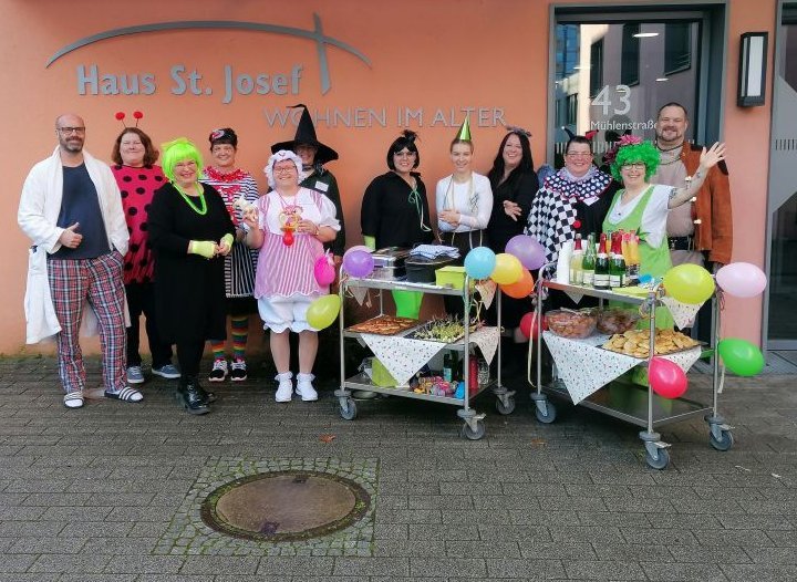 Seit mittlerweile drei Jahren ist das bunte Treiben am Altweiber-Donnerstag eine liebgewonnene Tradition im Haus St.Josef. War zu Beginn noch ein kleinere Personengruppe unterwegs, so hat sich mittlerweile ein engagierter Kreis aus Mitarbeitenden der Sozialen Betreuung, der Hauswirtschaft, Verwaltung und Pflege zusammengefunden. Zeitweise schließen sich feierbegeisterte Bewohnerinnen und Bewohner an. Neben ideenreichen Kostümen gehören reich gedeckte Servierwägen mit allerlei Köstlichkeiten (unter anderem Sekt/O-Saft, herzhafte und süße Häppchen wie Blätterteiggebäck, Trauben-Käsespieße, Mini-Frikadellen und Mini-Berliner) dazu. Am Vormittag des Altweiber-Donnerstags, in der Region auch Schwerdonnerstag genannt, zieht der muntere Trupp durch das Haus St. Josef und besucht die Seniorinnen und Senioren auf den Wohnbereichen. Besonders wertvoll sind die individuell gestalteten Kurzmomente mit ihnen: mal stößt man gemeinsam an und schunkelt, ein andermal schmückt man das Zimmer mit Luftschlangen, Ballons und Konfetti.