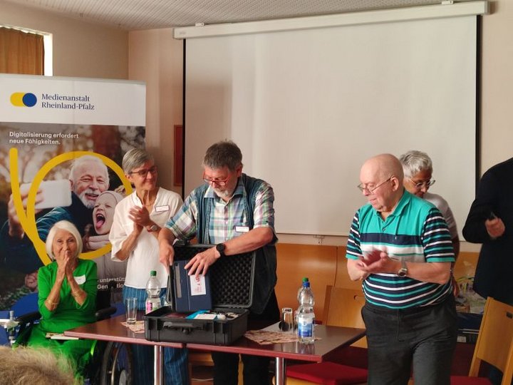Mit einer generationenübergreifenden Eröffnung begann die fünfte Woche der Medienkompetenz des Landes Rheinland-Pfalz in Bad Kreuznach: Im Elisabeth Jaeger Haus der Seniorenhilfe der Stiftung kreuznacher diakonie waren neben den Bewohnerinnen, Bewohnern sowie den Mitarbeitenden auch Grundschulkinder aus der Hofgartenschule mit ihrer Lehrerin gekommen. Auf ganz unterschiedliche Weisen haben sich beide Altersgruppen mit dem Thema Medienkompetenz auseinandergesetzt – jetzt nutzten sie bei der offiziellen Auftakt-Veranstaltung die Gelegenheit, das vorzustellen, was sie gelernt haben. Zuerst aber begrüßte Dr. Marc Jan Eumann, Direktor der Medienanstalt Rheinland-Pfalz, die Gäste im Café Elisabeth. Insgesamt 195 Aktionen, die in dieser Woche der Medienkompetenz im ganzen Land geplant seien, „sind für uns ein absoluter Rekord“, freute er sich. Weil die rheinland-pfälzische Bildungsministerin Stefanie Hubig erstmals nicht an der Eröffnung teilnehmen konnte, hatte sie ihr Grußwort per Film-Botschaft geschickt.