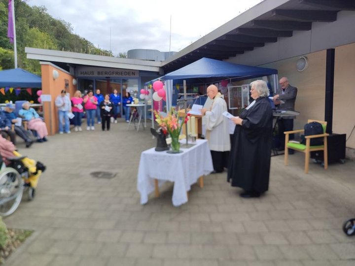 Sonnenschein, mit Luftballons geschmückte Zelte, Leckeres vom Grill und von der Kuchentheke, tanzende Kinder, Info-Stände, frisches Eis und vieles andere mehr: Die Mitarbeitenden des Hauses Bergfrieden der Seniorenhilfe der Stiftung kreuznacher diakonie haben sich sehr viel Mühe gegeben, um das 25-jährige Bestehen ihres Hauses zu einem unvergesslichen Fest zu machen. Pfarrerin Liesel Zumbro-Neuberger und Pfarrer Stefan Wolff erinnerten beim ökumenischen Gottesdienst zum Auftakt daran, dass es diese Einrichtung für Menschen im Alter ja schon viel länger gebe – aber der Neubau wurde eben vor genau einem Vierteljahrhundert in Betrieb genommen. „Damals bin ich in den Kirchenkreis gekommen“, berichtete die Pfarrerin, und es habe viele Diskussionen darüber gegeben, wie weit Kirche und Diakonie mitgehen dürfen, wenn tätige Nächstenliebe auch noch Profit abwerfen soll. Damals wie heute sei es eben wichtig, bei aller Arbeit und der finanziellen Rahmenbedingungen eben nicht zu vergessen, Gott zu danken, dass er uns das überhaupt ermöglicht. „Danke auch für die Gemeinschaft, die wir hier immer wieder erleben dürfen“, ergänzt Stefan Wolff.