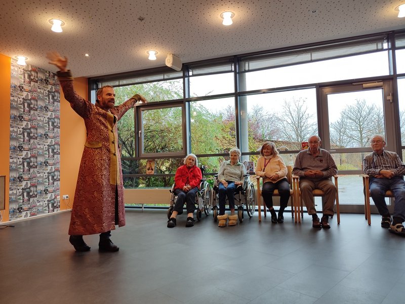 Dass die Märchen von einem Profi-Schauspieler vorgetragen werden, ist Teil eines ganz besonderen Programmes, das sowohl im Pfarrer Kurt Velten Altenpflegeheim, als auch im benachbarten Dr. Theodor Fricke Altenpflegeheim in Simmern umgesetzt wird. Dieses Programm kommt von MÄRCHENLAND, einem Zentrum für Prävention und Gesundheitsförderung aus Berlin, und beide Einrichtungen der Seniorenhilfe der Stiftung kreuznacher diakonie sind von diesem Kursangebot überzeugt. Dabei geht es dem Deutschen Zentrum für Märchenkultur beim Kurs „Es war einmal…. Märchen und Demenz“ darum, mit Hilfe lebendig erzählter Märchen die kognitive Leistungsfähigkeit der Zuhörerinnen und Zuhörer zu erhalten, ihre Erinnerungen an die alten Geschichten zu wecken und sie wach zu halten und damit gleichzeitig ihre psychische Gesundheit zu stärken. In der Praxis sorgen die Märchenstunden auch für eine Entlastung des Pflege- und Betreuungspersonals. Das haben die Mitarbeitenden schon nach der ersten Märchenstunde erlebt: „Bewohnerinnen und Bewohner mit Demenz haben sich bei der Märchenstunde an diesen immer wiederkehrenden Erinnerungsanker ‚Es war einmal‘, mit dem jedes Märchen beginnt, erinnert und mitgesprochen. Sind einige von ihnen sonst recht unruhig, so haben wir sie jetzt viel ruhiger erlebt. Am nächsten Tag war die Märchenstunde immer noch Thema. Die Menschen haben sich darüber ausgetauscht, wie toll das war, die Geschichten nicht einfach nur vorgelesen zu bekommen, sondern sie durch den Schauspieler erleben zu können“, schildert der Einrichtungsleiter des Pfarrer Kurt Velten Altenpflegeheims, Carsten Bachert.