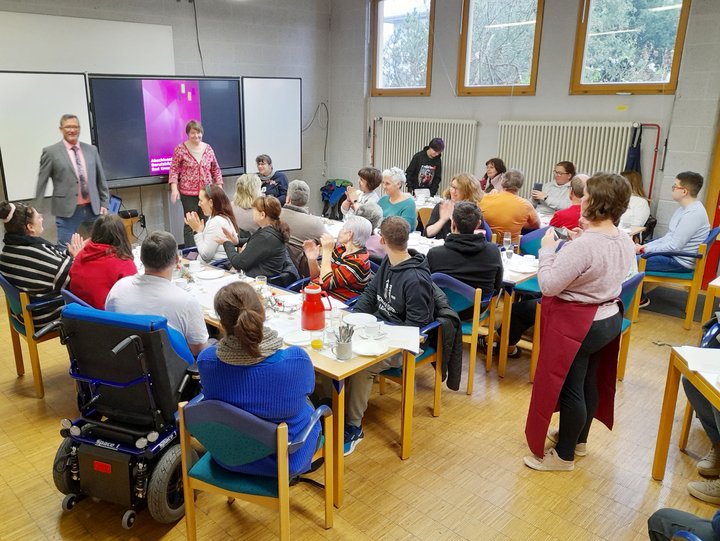Betriebsleitung, Sozialdienst und Bildungsbegleiter begrüßten alle Gäste. Nach einer Andacht wurden feierlich die Zertifikate übergeben und die Absolventen berichteten anschließend über ihre kommenden Aufgaben. So geht es für einige nun in Arbeitsbereiche wie Wäscherei, Schiefer-Eigenproduktion oder in die Konfektionierung von Seminarunterlagen für die Berufsgenossenschaft.