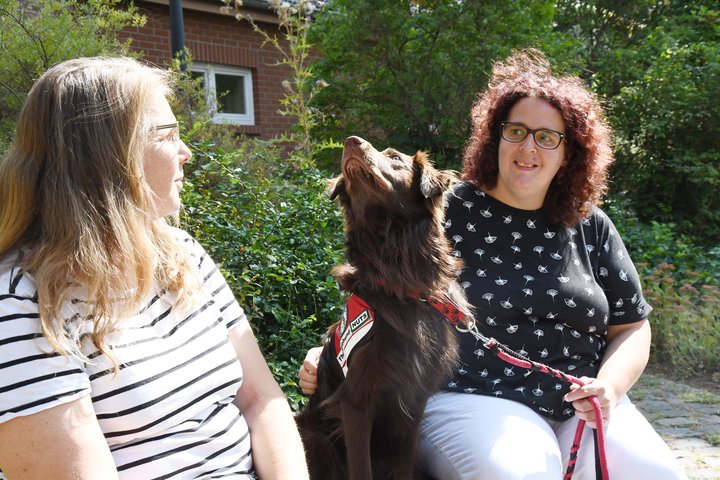 Gudrun Gaul und „Nuts“ sind Profis. Der Australien Shepard hat alle Prüfungen bestanden und ist zertifiziert als Therapiehund. Natürlich nur in Kombination mit Gudrun Gaul, die vor allem mit Menschen mit psychischen Problemen arbeitet. „Die Klienten lernen, sich auf den Hund einzustellen und dessen Bedürfnisse zu respektieren.“ Sitz und Platz muss man „Nuts“ nicht beibringen. Im Gegenteil: „Nuts“ ist ein ganz subtiler Trainer. Er bringt Lebensfreude, Energie und Vertrauen mit, und gemeinsam mit dem Hund können Menschen mit Behinderung einen Blick auf neue Welten werfen.